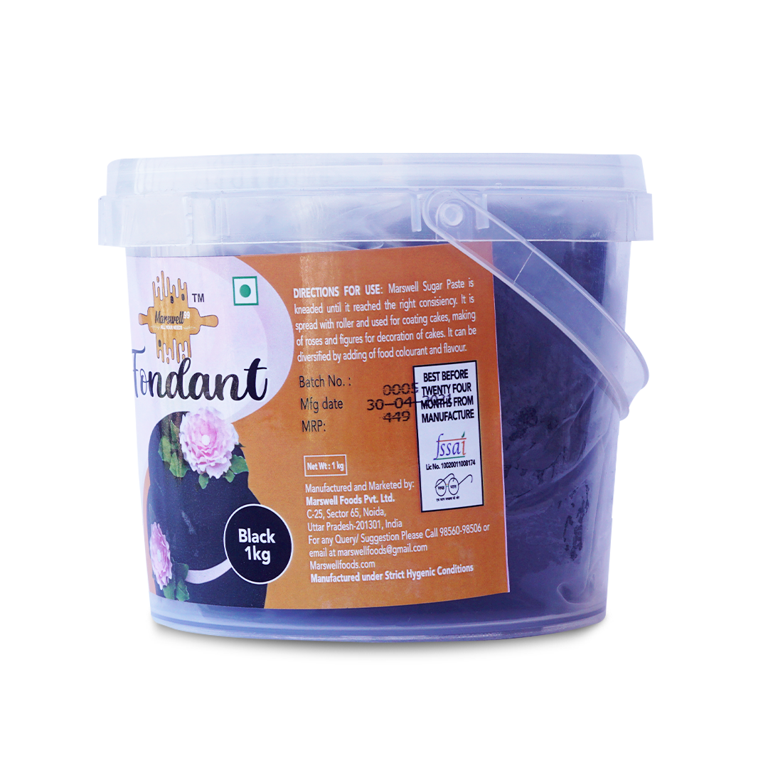 Marswell Black Colour Fondant Sugar Paste Cake Decorative | 1 kg can be smooth and simple or detailed and aesthetic. This icing’s smooth, dough-like structure makes it an ideal medium for cake decorating creativity. A smooth cake is graceful even without extensive decorations, and fondant is a popular choice for wedding cakes.