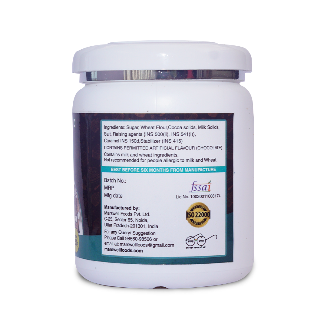 Sugar, Wheat Flour, Cocoa Solids, Milk Solids, Salt, Raising Agent (INS 500(i), INS 541(i)), Caremel 150d, Stabilizer INS 415