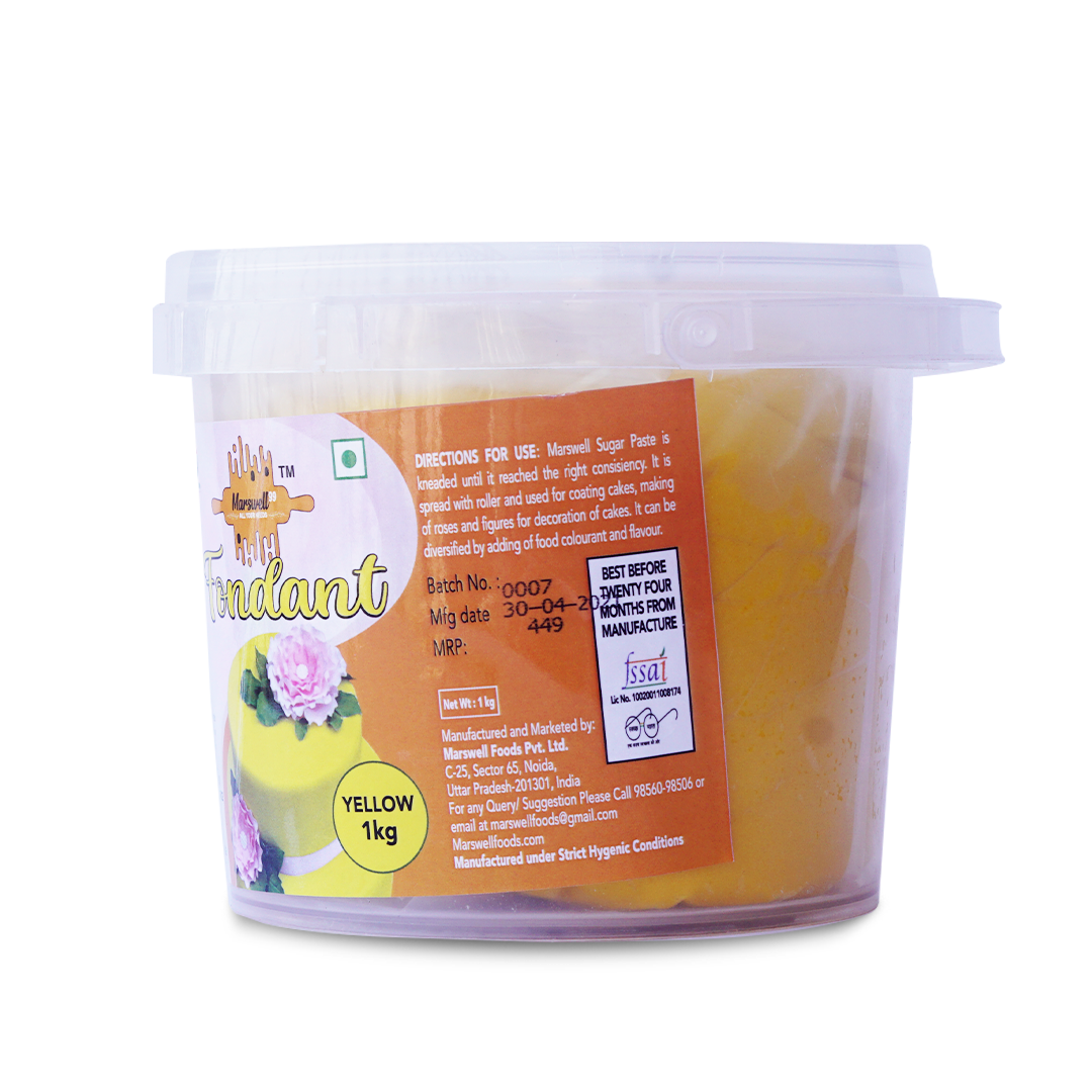 Marswell Yellow Colour Fondant Sugar Paste Cake Decorative | 250g can be smooth and simple or detailed and aesthetic. This icing’s smooth, dough-like structure makes it an ideal medium for cake decorating creativity. A smooth cake is graceful even without extensive decorations, and fondant is a popular choice for wedding cakes.