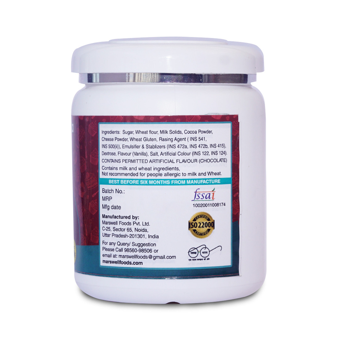 Sugar, Wheat Flour, Milk Solids, Cocoa Powder, Cheese Powder, Wheat Gluten, Raising agent (INS 500(ii), INS 541(i)), Emulsifier (INS 472, INS 472b INS 415), Salt, Artificial Colour INS 122 INS 124)