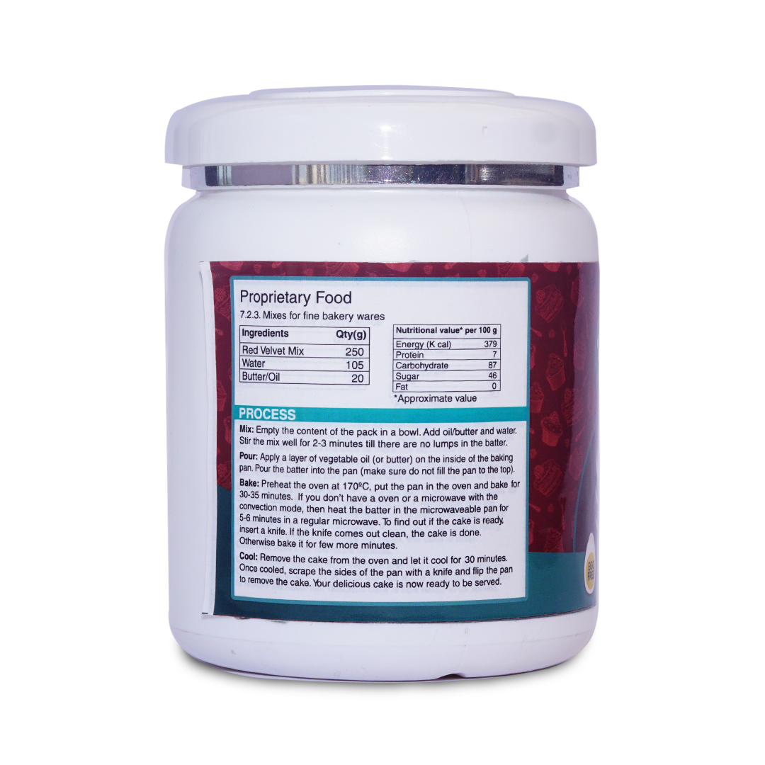 Marswell Egg Free Red Velvet Cake mix Powder 350g is a convenient mix to prepare moist eggless red velvet cakes and sponges with nice rise, preferable output volume, good stability and an uniform crumb structure. It is an easy to use mix, that is perfect for preparing any kind of egg free layered cake mix or marble cake and has a perfect hint of red velvet that tastes delicious with any whipped frosting you may be planning to use it with. This mix is an ideal solution for all professional as well as industrial bakers looking to delight their customers by preparing delicious eggless red velvet cakes with minimum, efforts and in a short time.
